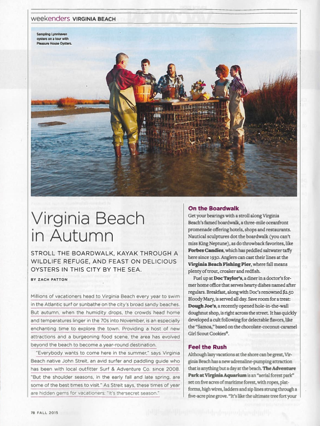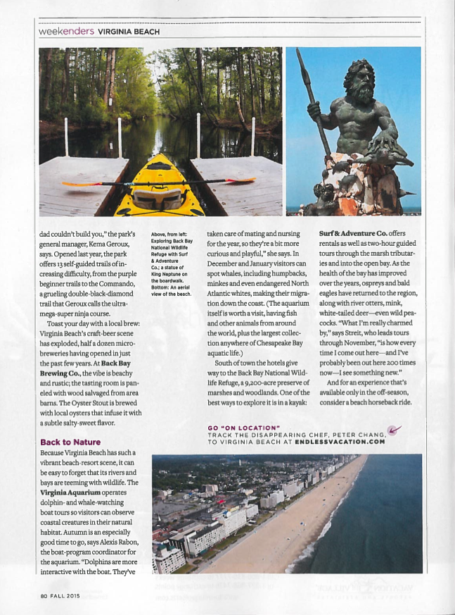 Words & photos by John Streit. Our very first kayak tour of 2015 has become our latest press clipping! We were stoked to see the work of travel writer Zach Patton come to fruition in the current issue of Endless Vacation Magazine, a publication with a circulation of more than 1.8 million, in which Surf & Adventure Co. is included as part of his “Virginia Beach in Autumn” piece. In the article, Zach explores the tourism opportunities Virginia Beach offers in the fall shoulder season, which truly is a special time to experience our city. The summer crowds are drastically diminished and summer heat and humidity are replaced by more pleasant temperatures and markedly drier air. While the piece is geared toward informing outsiders of our hometown attractions, locals alike can glean helpful tips from this comprehensive guide to our “secret season.” Jump this link over to Endless Vacation’s website to check out Zach’s article, or check out the sliders below for the story as it appears in print and the photos from Zach’s springtime exploration of our Back Bay waterway. Leave a Reply Cancel ReplyYou must be logged in to post a comment.